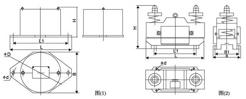 外型尺寸如圖:圖(2)為CZ250、CZ400、CZ600、CZ800、CZ1000型螺旋彈簧倉振器,圖(1)為CZ10型、CZ50、CZ100型環(huán)氧板簧倉壁振器。