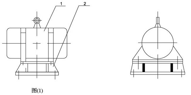ZFB系列防閉塞裝置的結構如圖1所示。由振動電機(1)、底座(2)兩部分組成。振動電機和底座由螺栓緊密地固定為一體。由于底座緊固地安裝在料倉壁上,這樣就構成了單質點定向強迫振動系統(tǒng)。
